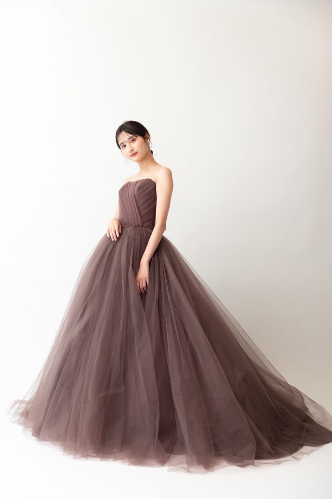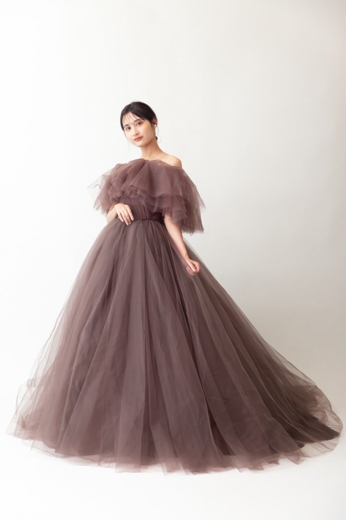 深いブラウンの絶妙な色合い、ソフトチュールをたっぷり使ったアーティスティックなドレス。