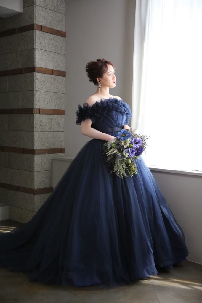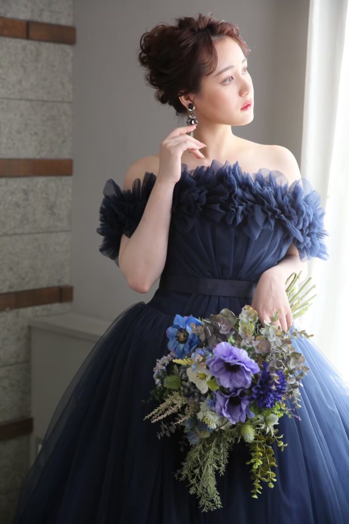 こっくりとしたネイビーカラーのドレス。胸元のチュールが大人カワイイを演出してくれます。