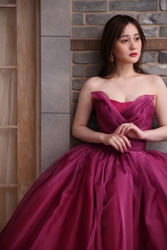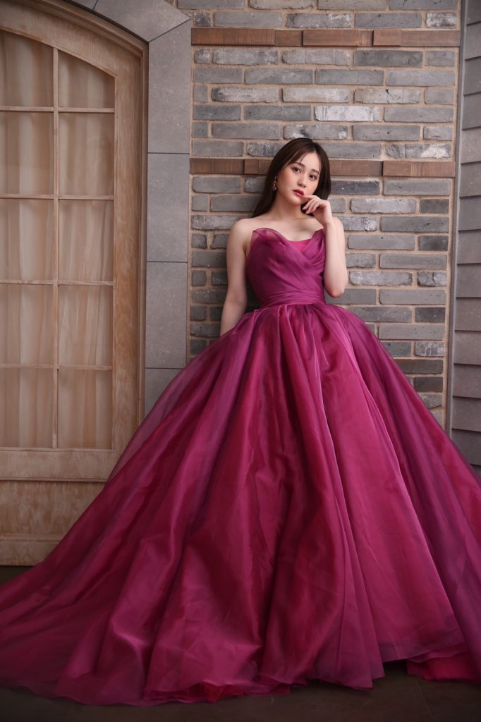 鮮やかなマゼンタピンクが印象的な1着。ボリューム感たっぷりなスカートラインはゴージャスな印象になります♡