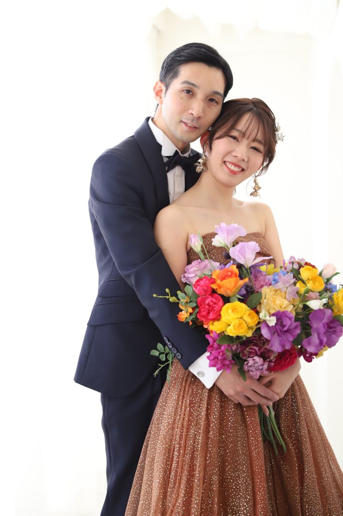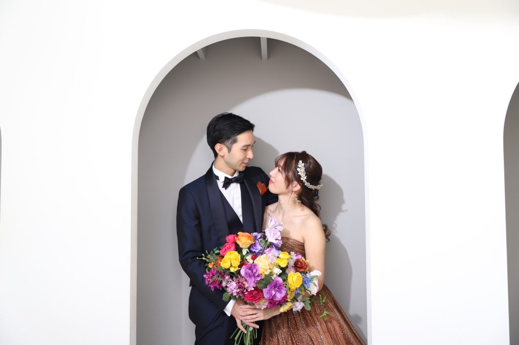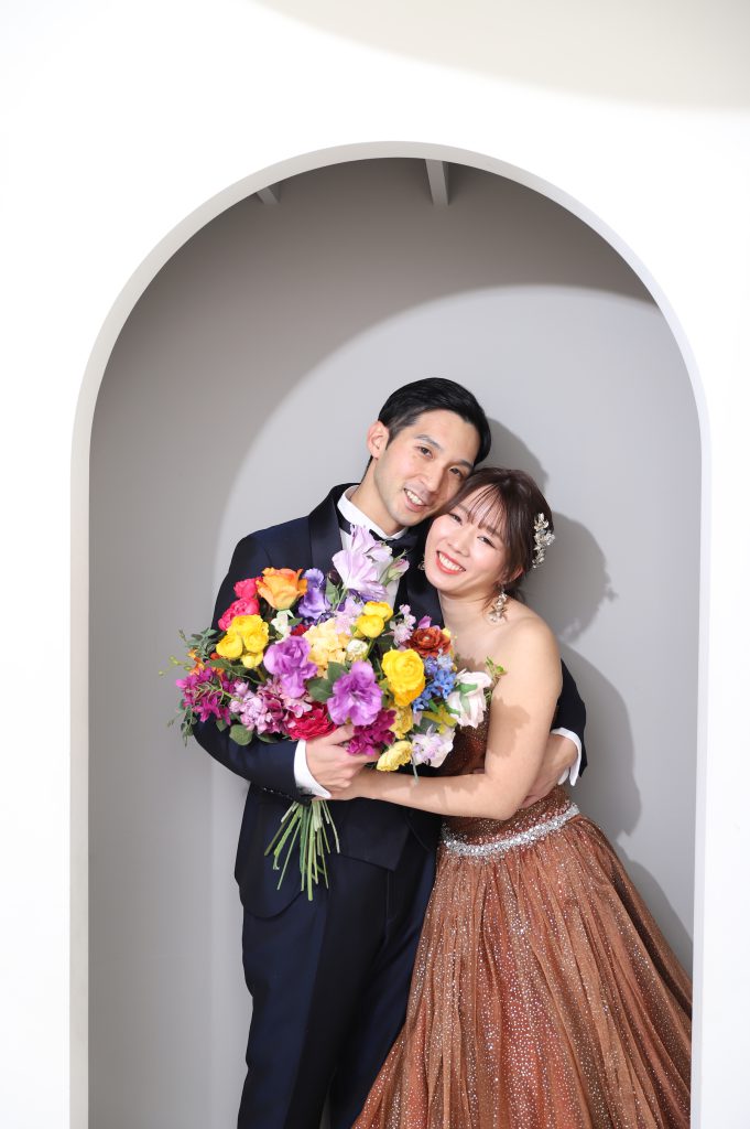 白を基調としたアーチスタジオに映えるカラフルなお花のブーケで、ハッピー感あふれるお写真に♡