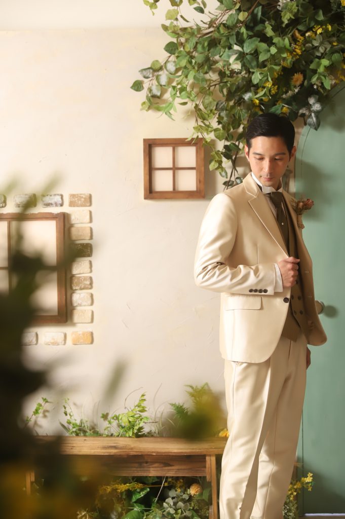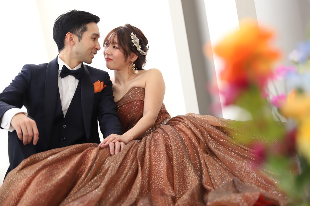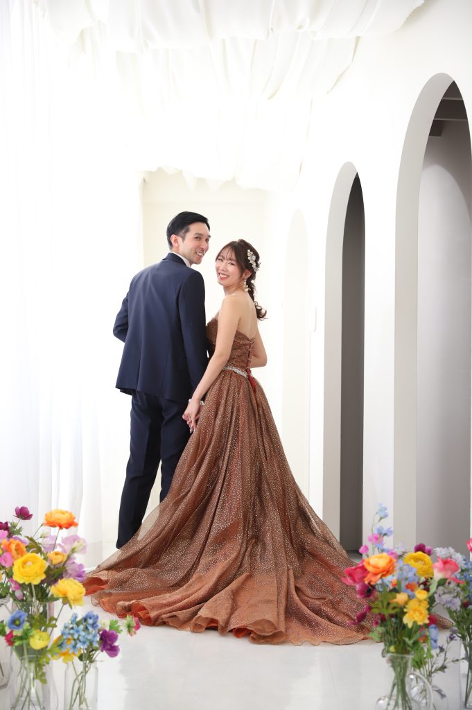 まずは、タキシード×ブラウンのカラードレスで明るい雰囲気で撮影開始!