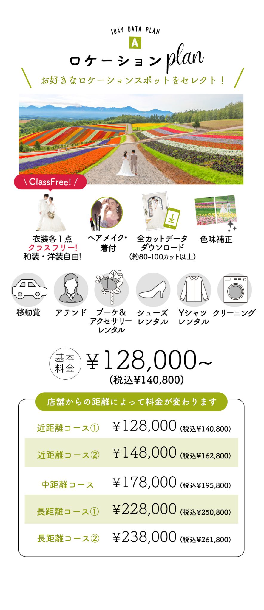 ※店舗から撮影場所までの距離によって基本料金は変動いたします。