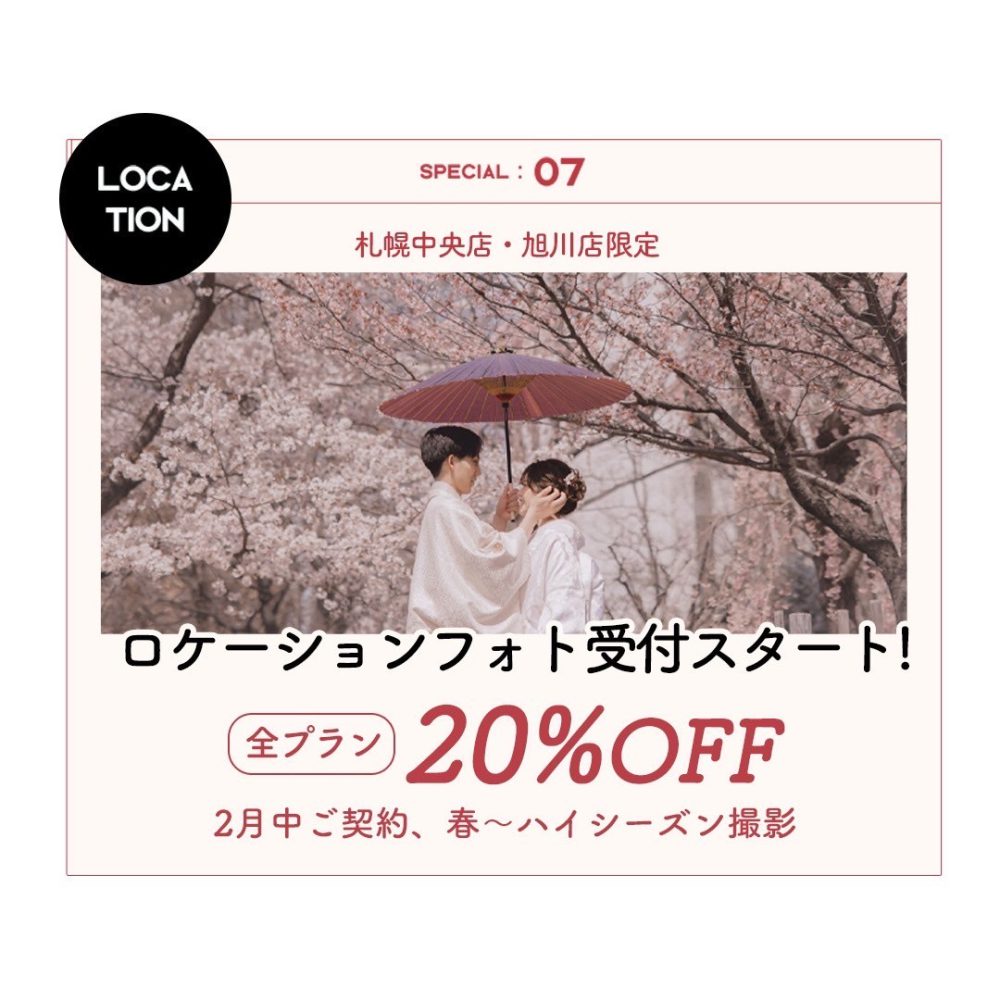 北海道札幌市のウェディングフォトスタジオの写真工房ぱれっと札幌中央店です。 残り数日でお得な2月キャンペーンのご案内が終了となります。今月はロケーションフォトがお得に叶えられるキャンペーンを実施しておりますので、改めてご紹介!春ロケ検討中のカップル様は必見です◎