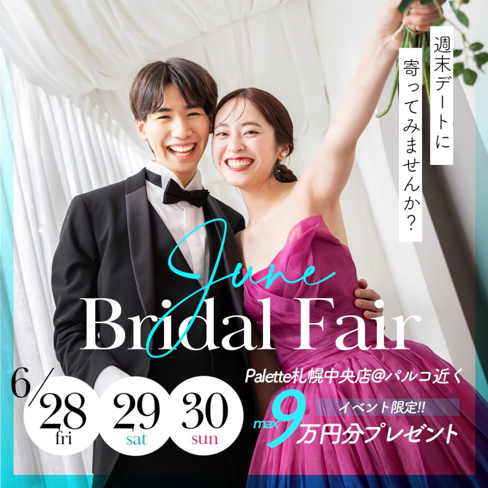 北海道札幌市中央区のウェディングフォトスタジオの写真工房ぱれっと札幌中央店です。今月末28日〜30日にご来店・オンライン相談された方に嬉しいジューンブライドフェアを開催♡Premier Line特別試着会や限定プラン、限定特典までご用意しておりますのでぜひこの機会をお見逃しなく!!