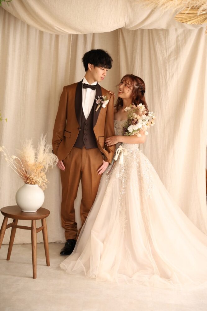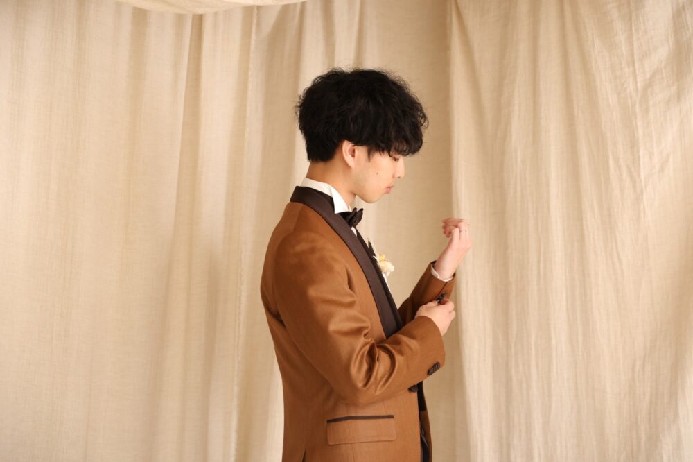 ご新郎も色合わせをして深めのブラウンタキシードをチョイス。