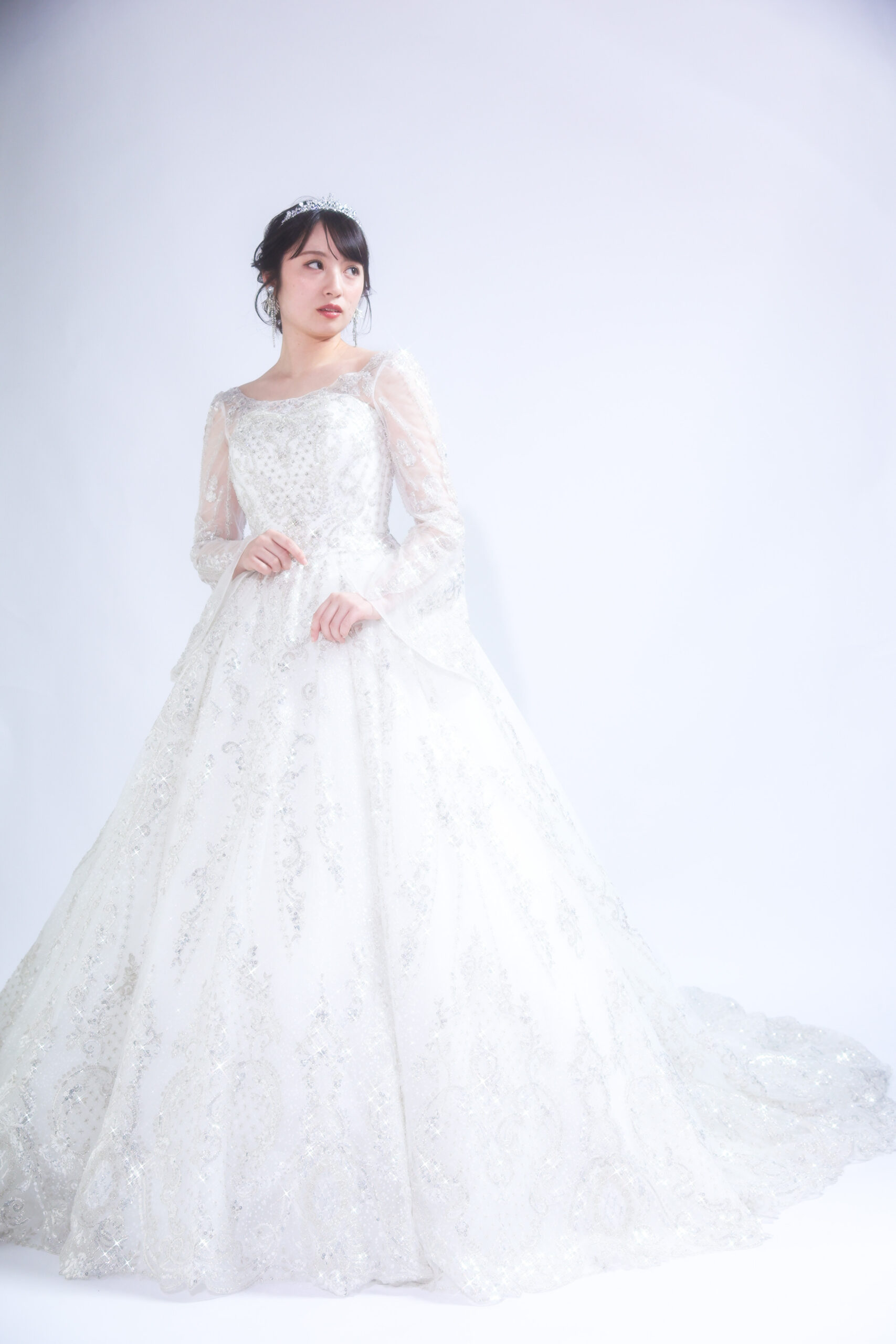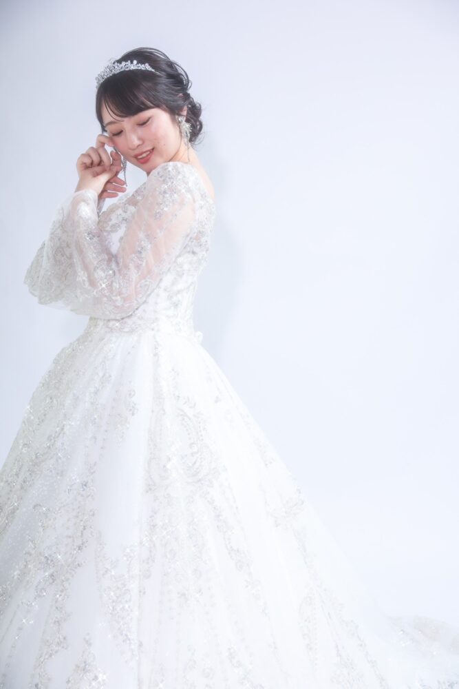 そのキラキラ感は纏った瞬間に心躍る衣装がテーマであるプレミアラインのテーマにぴったりな1着です。