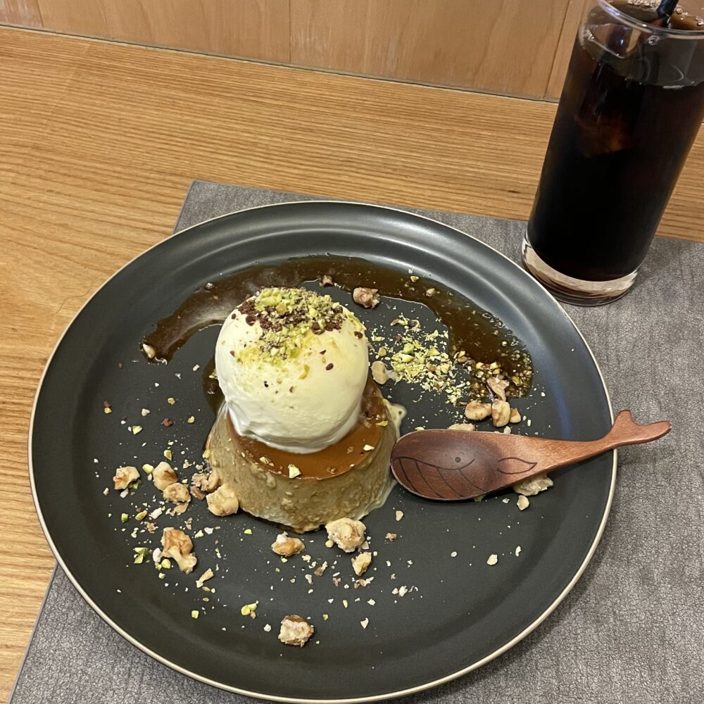 濃厚な固めプリンの上にはさっぱりしたバニラアイスと砕かれたピスタチオ。