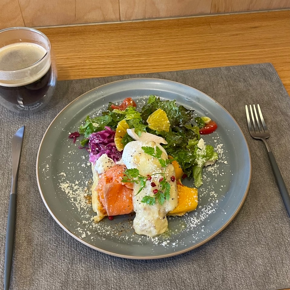 フワトロの甘いフレンチトーストに半熟卵やサーモンを使った甘じょっぱさが癖になる一品。