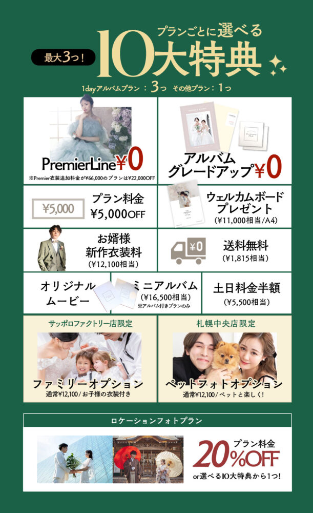 その他土日祝日料金が半額、お婿様の新作衣装料金無料など人気オプションが5つもセレクト可能。おふたりでどれが良いかな?と悩むのも楽しみの一つです。