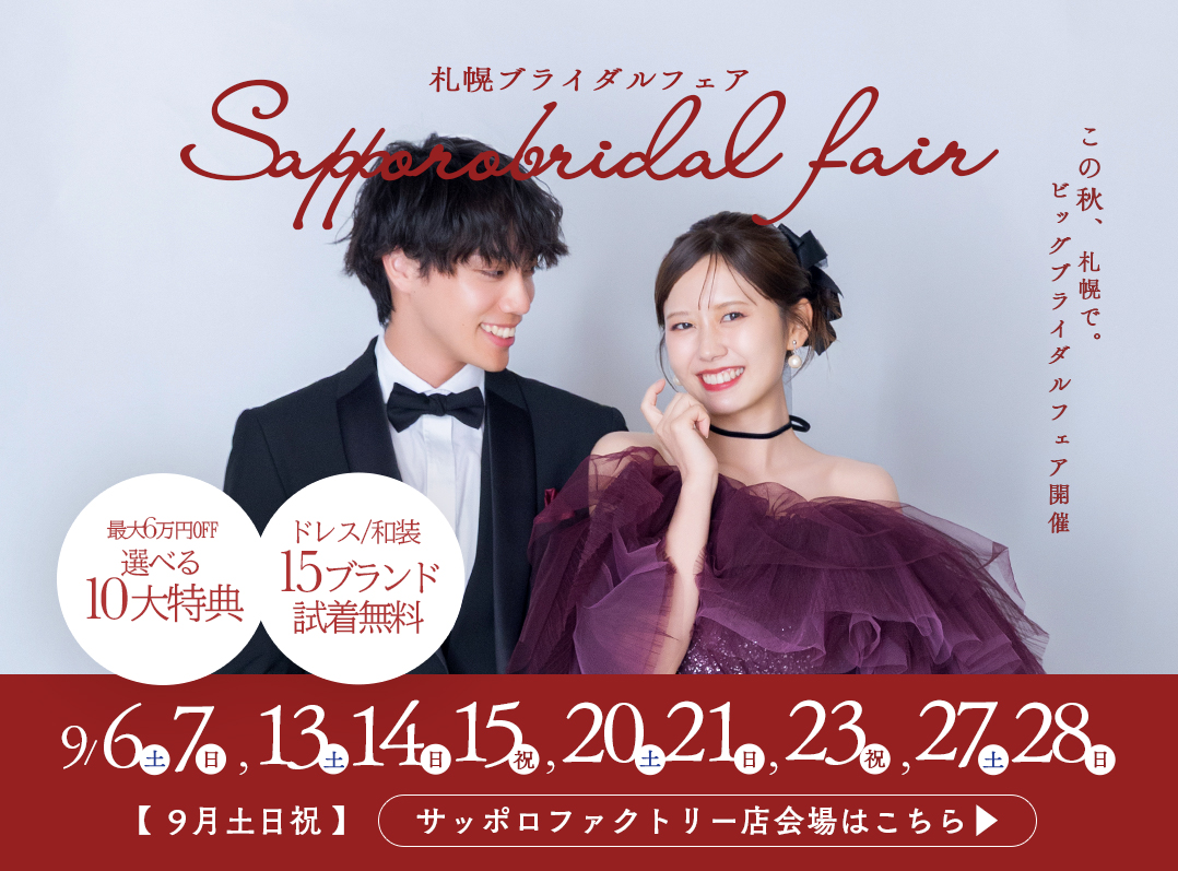 2025年9月毎週末開催!の札幌ブライダルフェアのご案内。サッポロファクトリーと、札幌大通にある札幌中央店と同時に行っております。「ビューティ専門型スタジオ」による最新衣装の無料試着のほか、フェアだからこそのお得なキャンペーン内容をご用意。