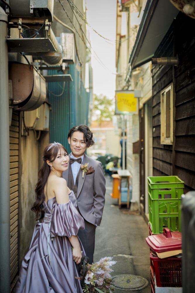 日常の風景の中に、特別な衣装をまとったお二人が立つことで、非日常的な美しさが生まれています。