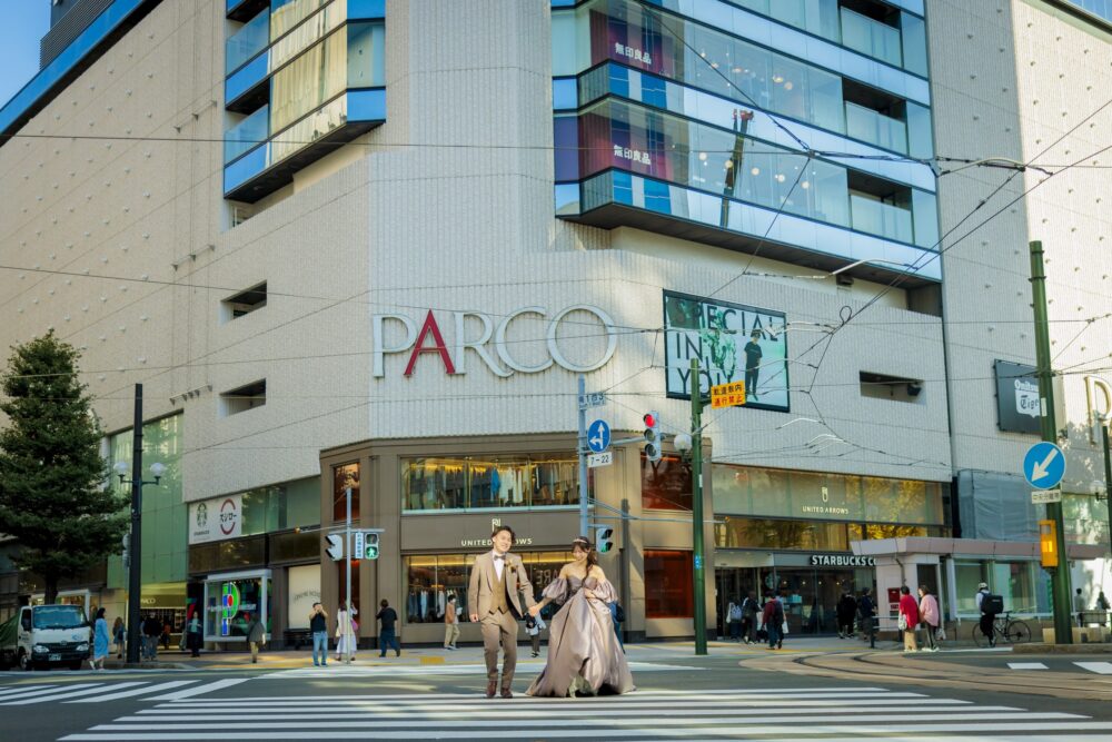 「PARCO」のロゴを背景に取り入れた、札幌らしい都会のランドマークでの撮影。ファッションビルを背景にすることで、