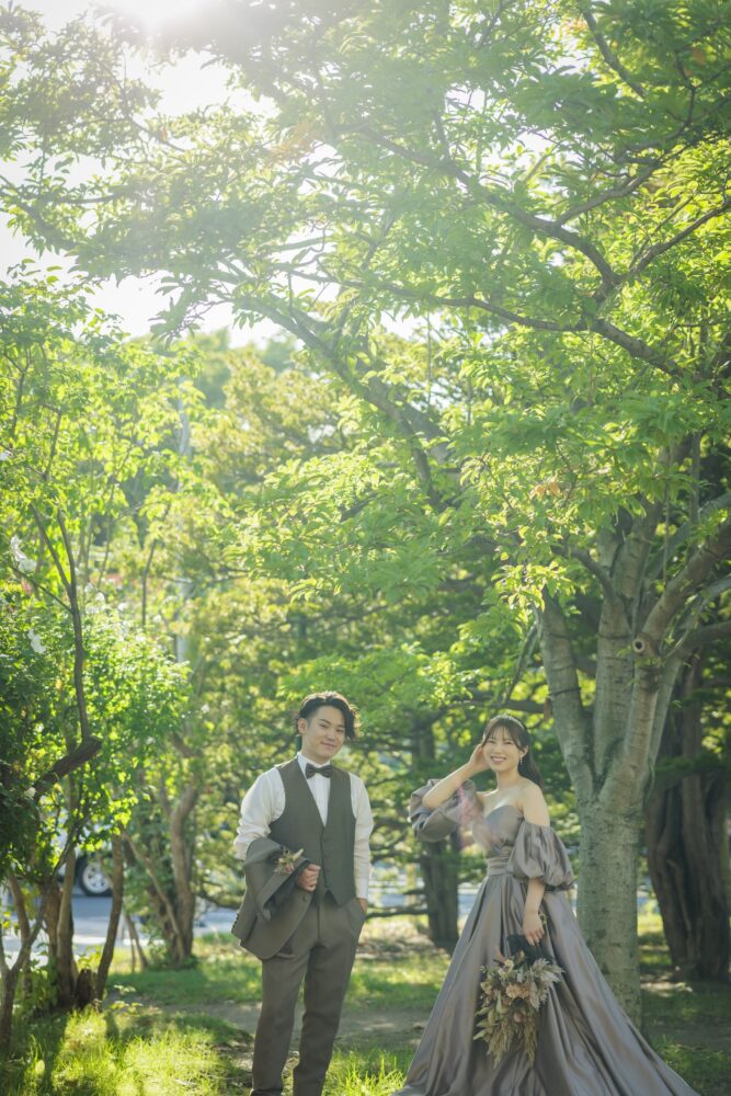 上部から降り注ぐ柔らかな木漏れ日が、お二人を優しく包み込み、透明感あふれるナチュラルな美しさを際立たせています。