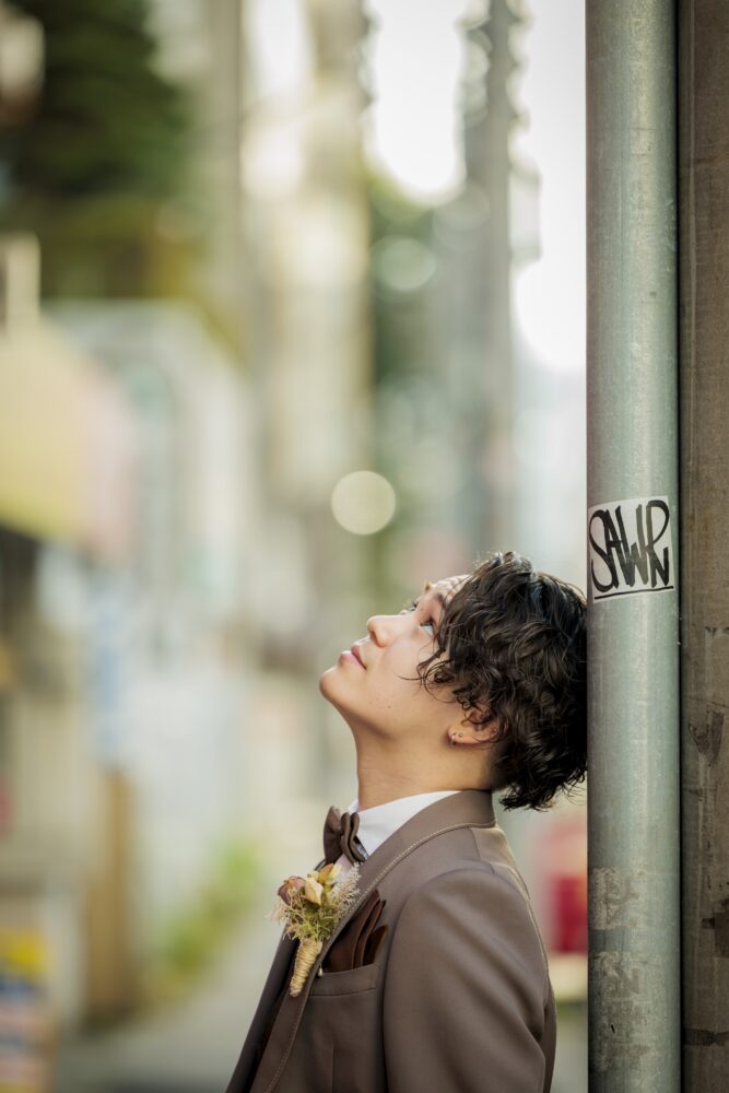 花婿様がポストに寄りかかり、花嫁様と視線を交わす親密な構図が、リラックスしたお二人の関係性を物語っています。