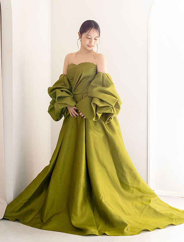 深い緑色のオフショルダードレスを着用しており、特にボリューミーな袖とドレープが印象的です。