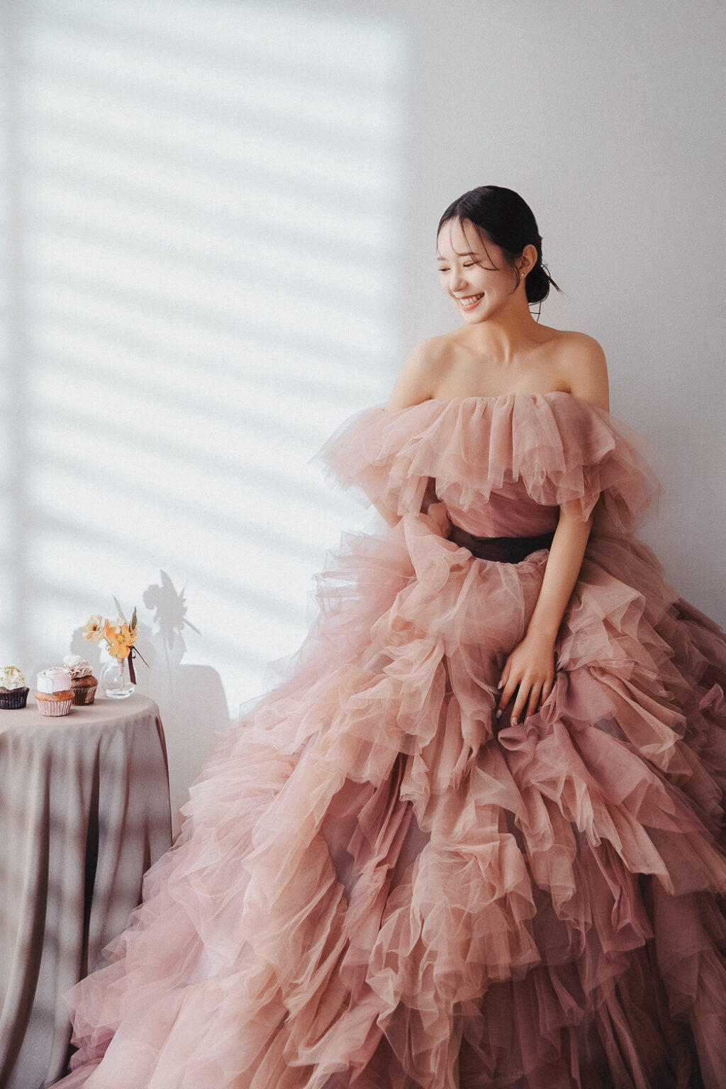 立ち姿だけでは無く、座ってドレスの中に埋もれるようなショットも撮影可能です。