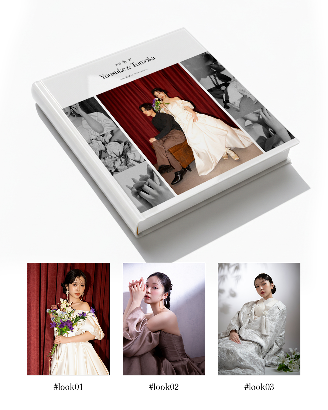 新郎新婦の衣装3着ずつ、ヘアメイク・着付け、全カットデータダウンロード(約140カット以上)が含まれています。