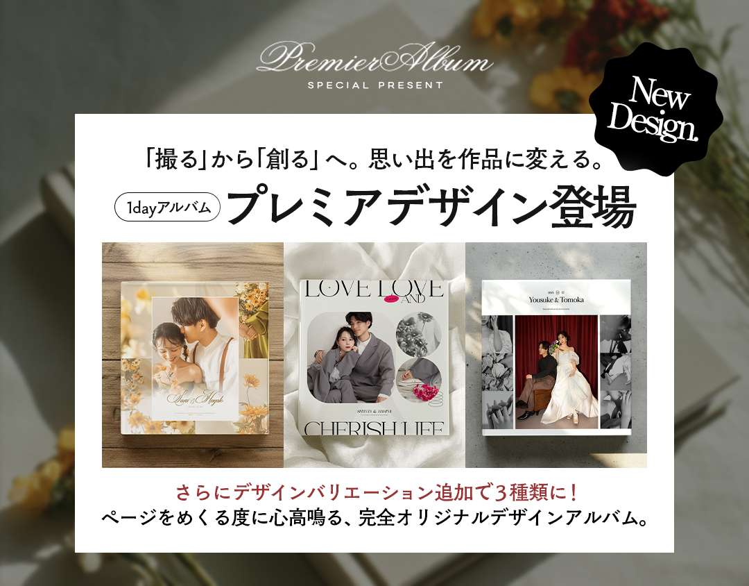 2025/11/291日で最高の一日を彩るウェディングフォトプラン「1dayアルバム plan」に新たな選択肢!”プレミアデザイン”登場