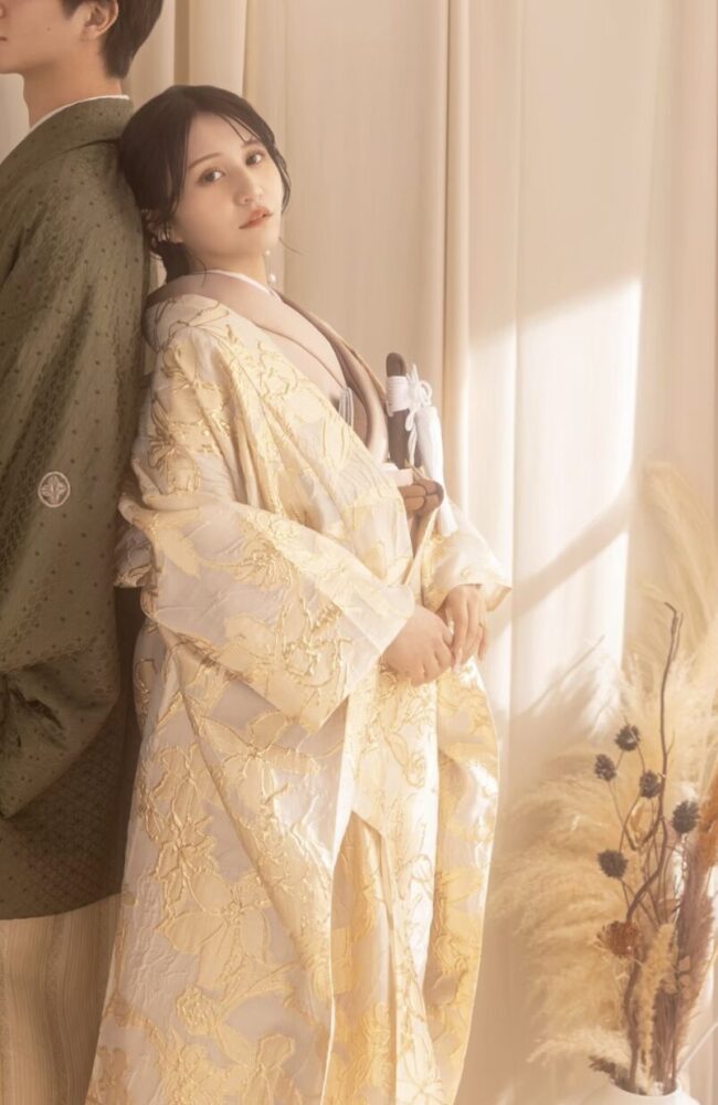また、伝統技法「しょうは織り」を用いたゴールドベージュの打掛など、職人技が光る逸品も。