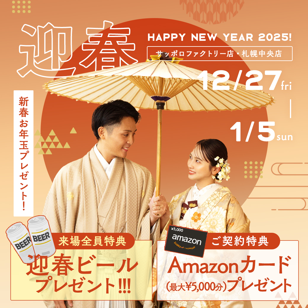 北海道札幌市中央区のウェディングフォトスタジオの写真工房ぱれっと札幌中央店です。 本日は、明日から開始する〝新春お年玉プレゼント企画〟の詳細をお伝えします♩ これからフォトウェディングや、結婚式の前撮りをお考えの方は必見です◎