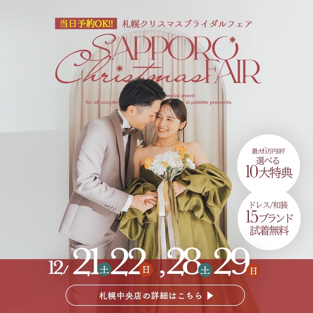 北海道札幌市中央区のウェディングフォトスタジオの写真工房ぱれっと札幌中央店です。本日は年末年始の撮影希望の方必見!撮影本番の空き状況のお知らせや今週末のお得ばブライダルフェアのご紹介をいたします♡