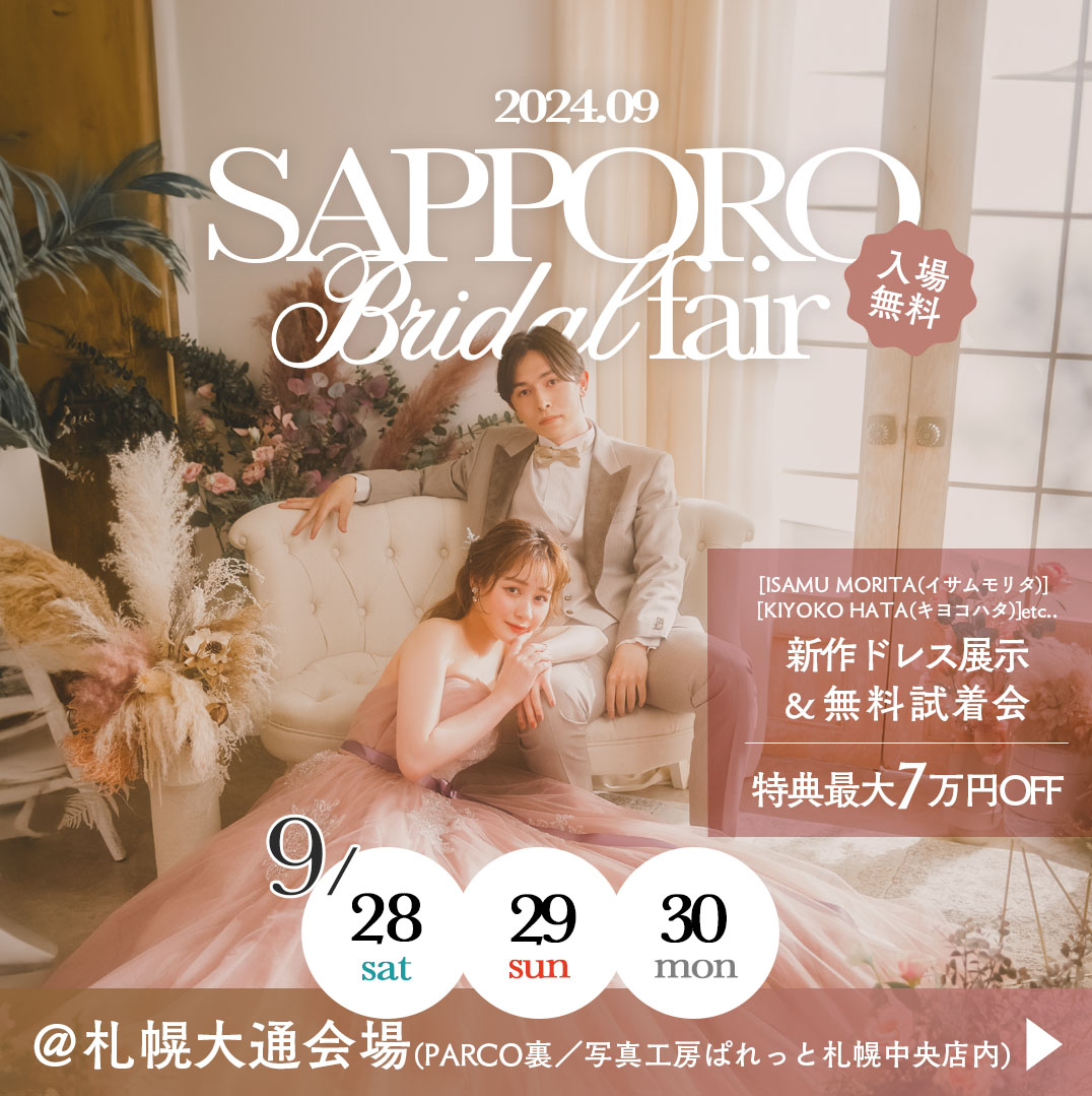 9月21日(土)22日(日),23日(月祝)・28日(土)29日(日)30日(月)開催の札幌ブライダルフェアのご案内。最新衣装の見学&無料試着のほか、フェアだからこそのお得なキャンペーン内容をご用意。