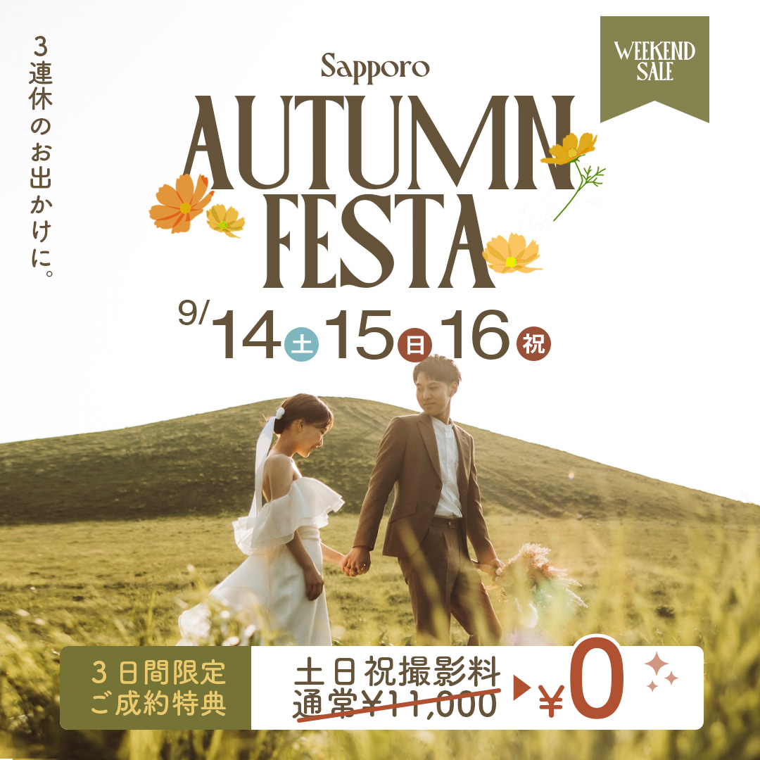 北海道札幌市中央区のウェディングフォトスタジオの写真工房ぱれっと札幌中央店です。本日よりウェディングフォトをご検討中のおふたりに嬉しいPaletteオータムフェストを開催♩3連休限定特典もご用意しておりますのでぜひ大通デートや大通オータムフェストの寄り道にご相談に来てください!