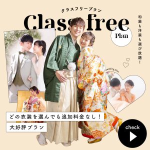 どの衣装を選んでも追加料金一切なし!衣装クラスフリーのプランが新登場いたします。各種キャンペーンとの併用で、おふたりらしいフォトウエディングをお得に叶えませんか?