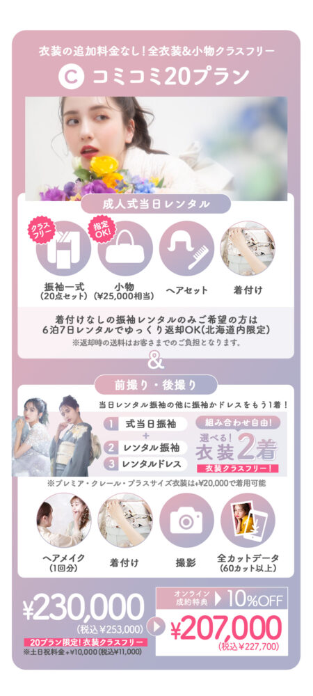 当日レンタル派も撮影のみ派にもご満足いただけるたくさんのプランをご用意しております。