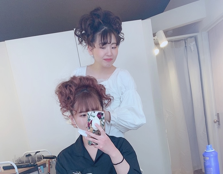 (同期のヘアメイクでお互いに練習している様子です笑 ↓)