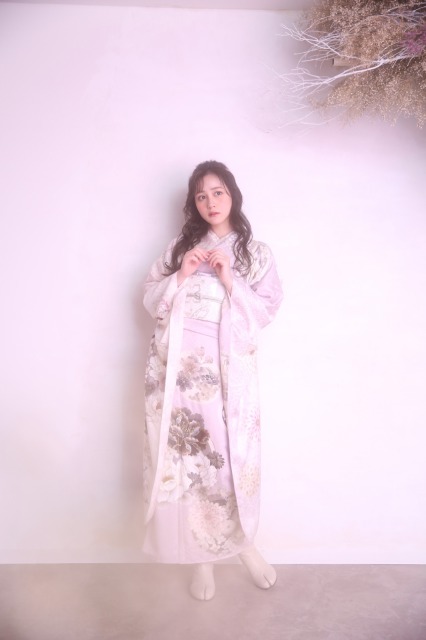 振袖らしい華やかな色味に伝統的な牡丹と菊の花が映える1着。