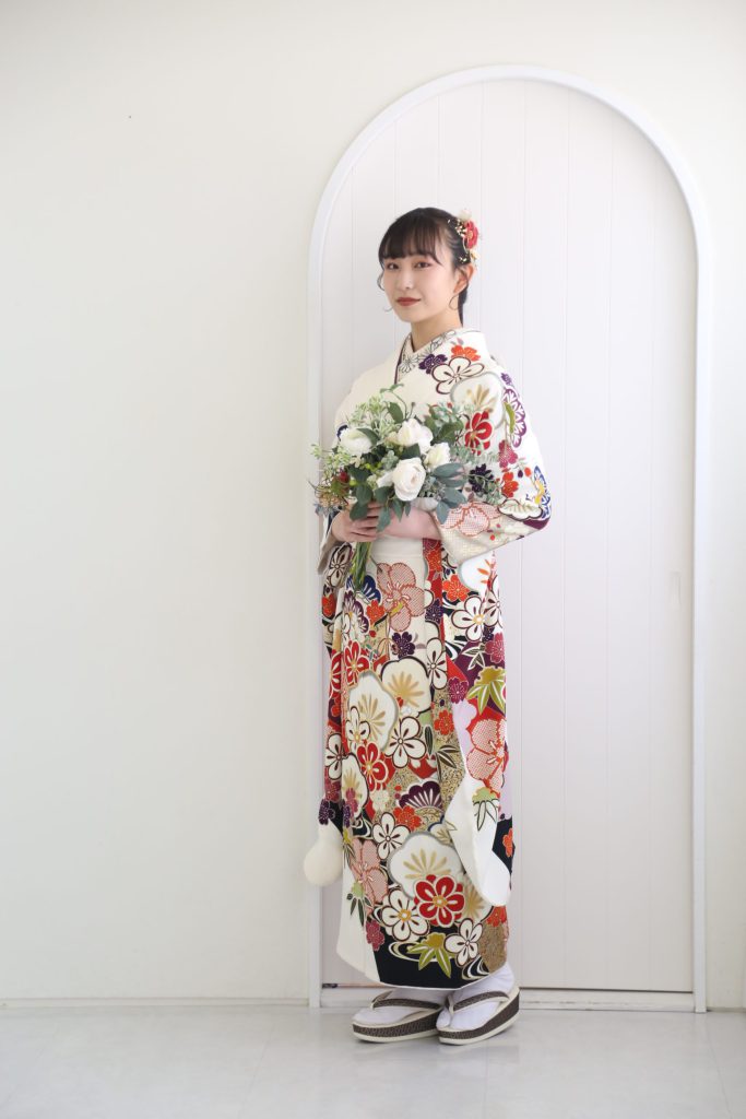1着目は白地に色鮮やかなデザインが施されたお振袖をお選びいただきました。