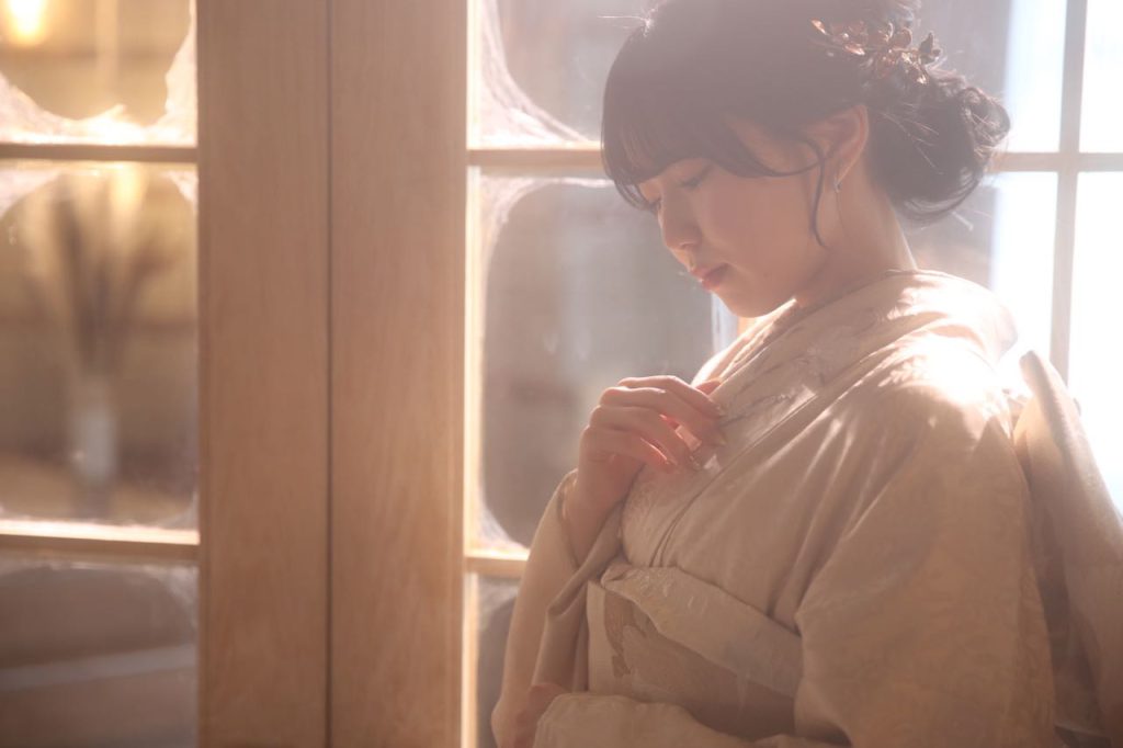 白い振袖とハレーションのはいる背景は相性抜群です!