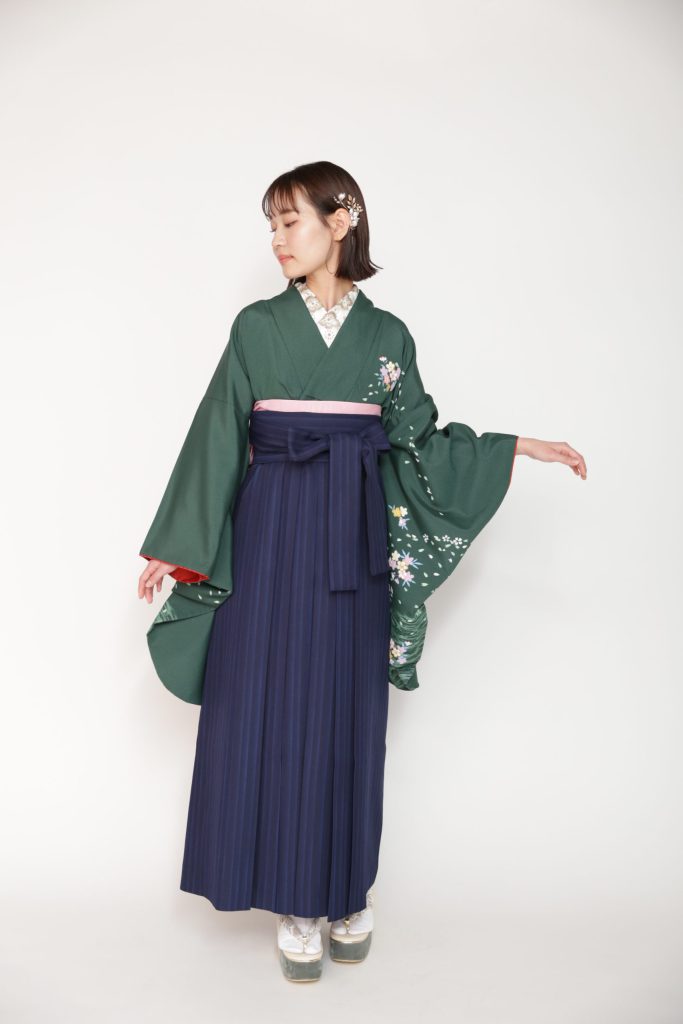 当店大人気のベージュ振袖とグリーン袴を合わせた1着。