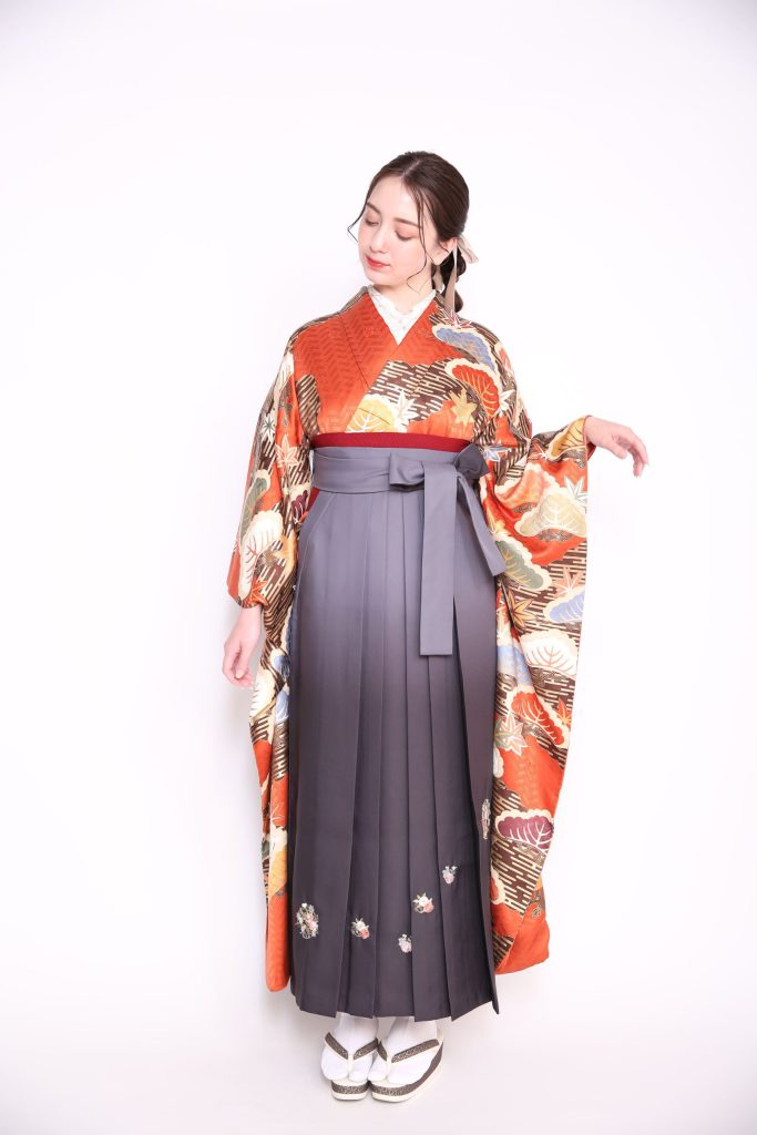 オレンジカラーのお振袖とグレー袴を合わせた1着。