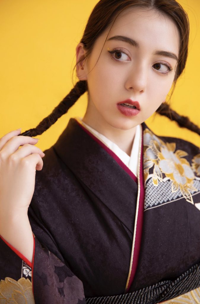 重ね襟に合わせたカシス色のリップが主役のメイク。