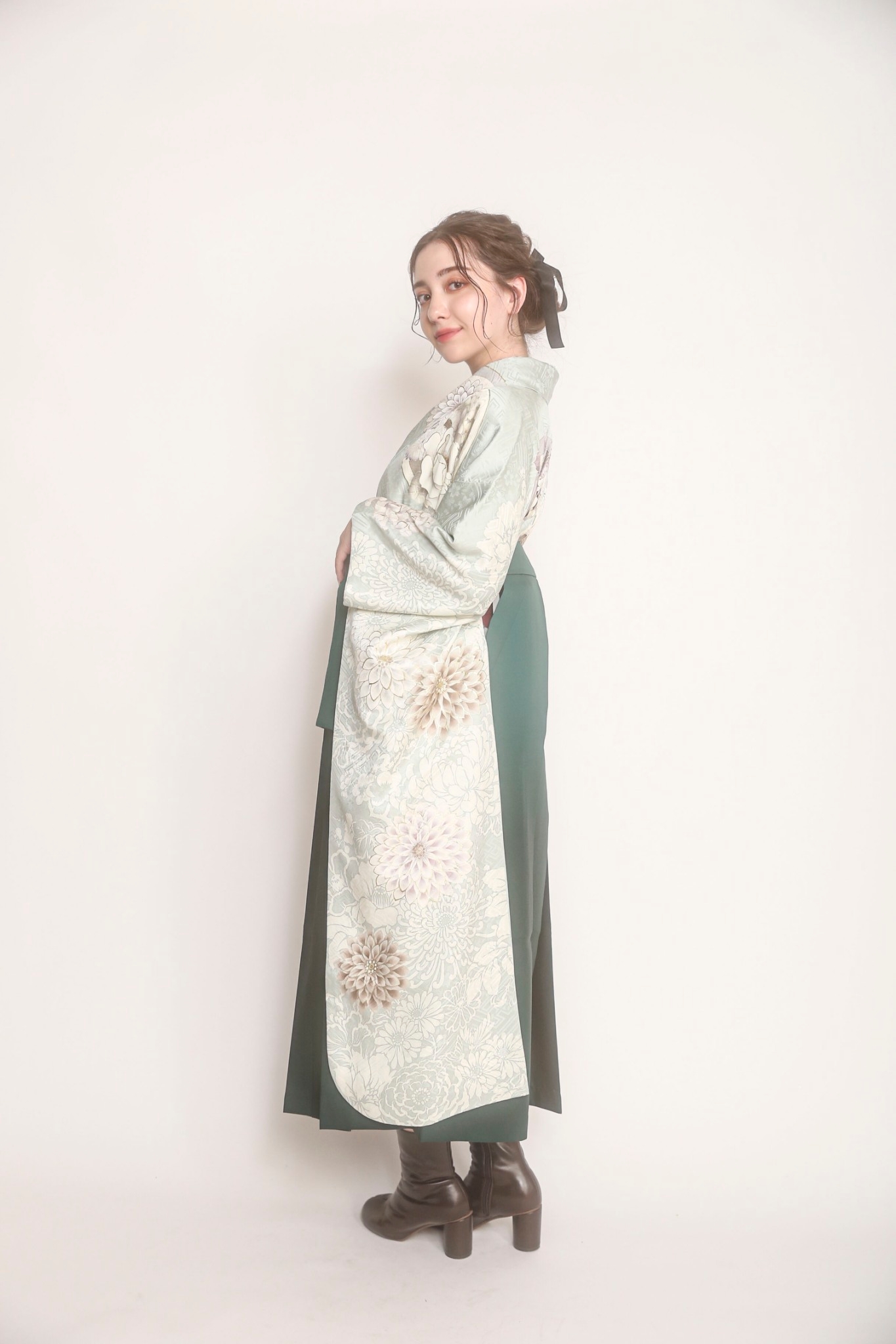当店大人気のベージュ振袖とグリーン袴を合わせた1着。