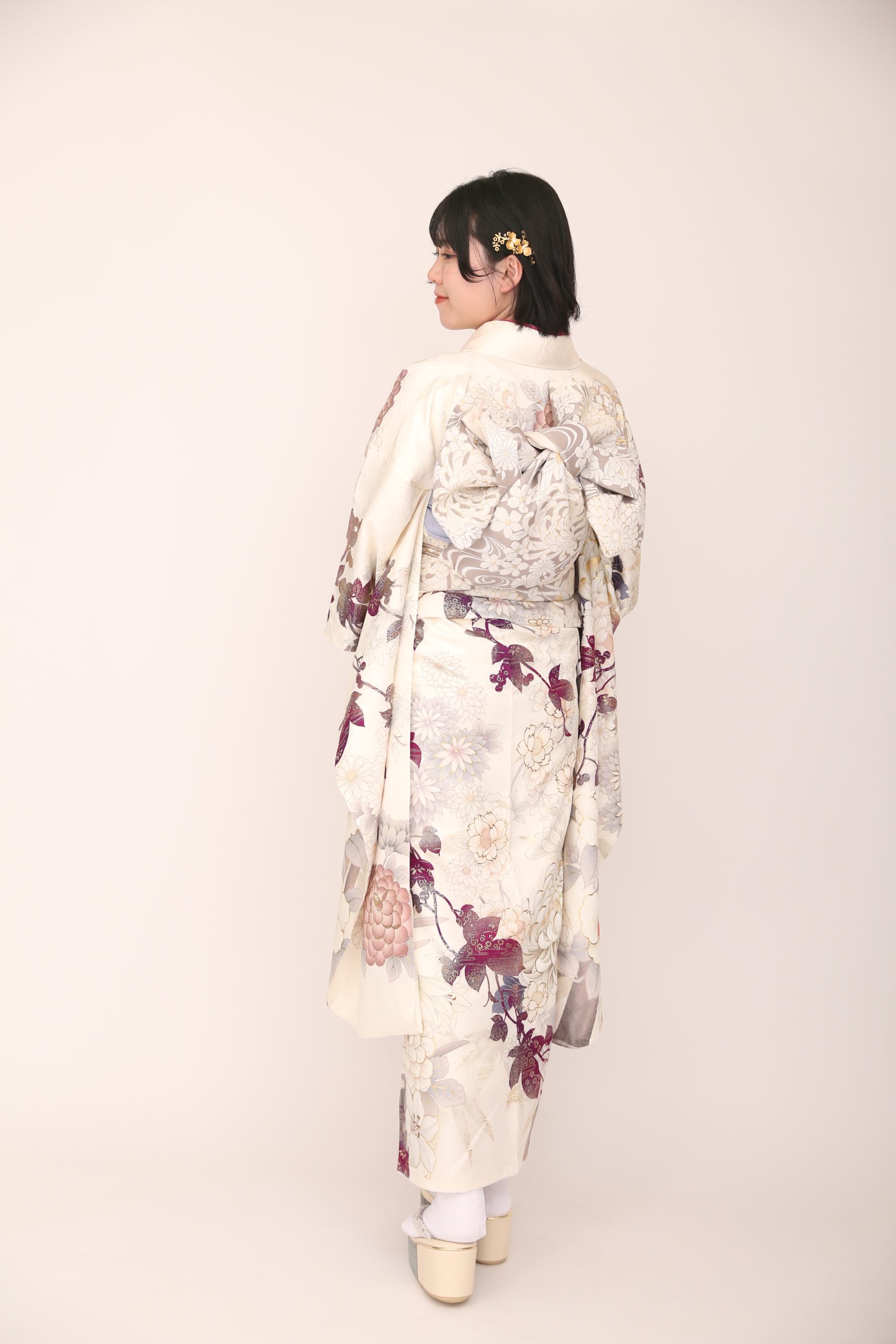 淡い白地の振袖に濃いパープルや薄いパープルなどの花が全体に散りばめられている振袖。