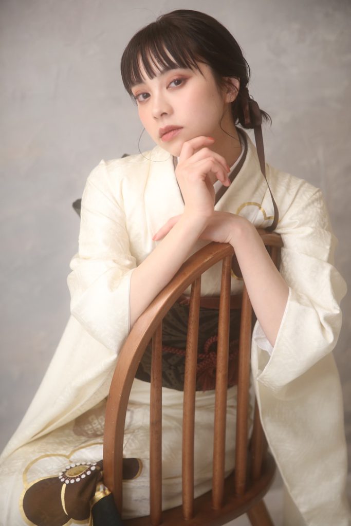 シンプルな背景ですが、ショールやお鞄を使ったり、ヘアアクセサリーで