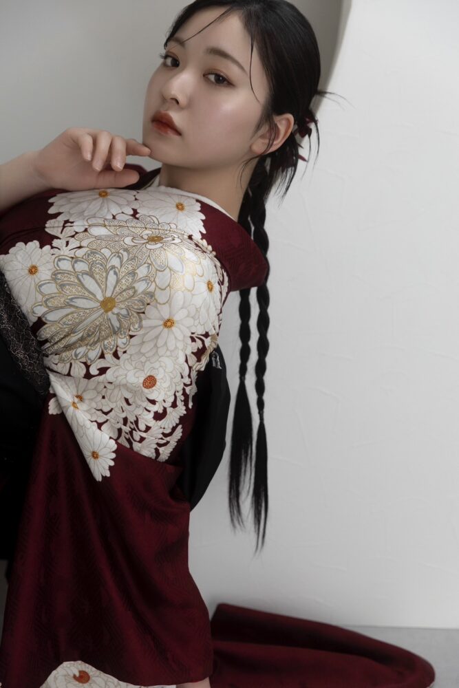 こちらは白やピンクを基調とした振袖に少しくすみがかった赤色の袴をコーディネートしました。