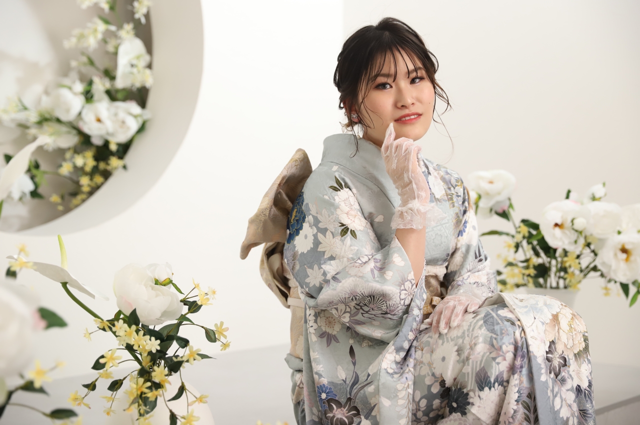 お振袖のデザインと周りに飾ったお花がマッチして上品な印象に。