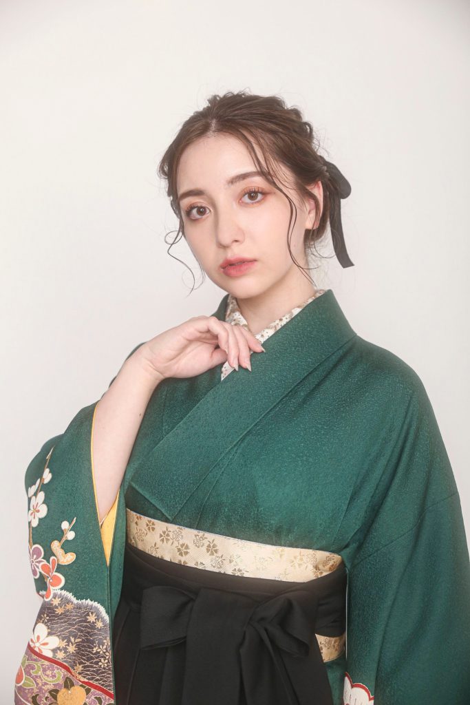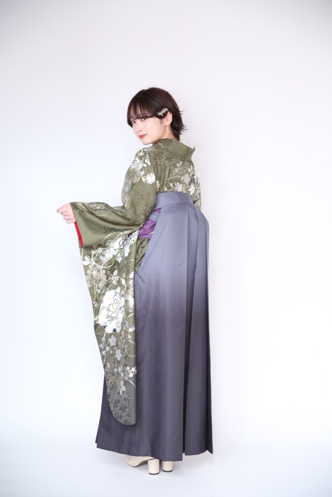 こちらは白いお花があしらわれているグリーンの振袖にグレーのグラデーションの袴をコーディネート。