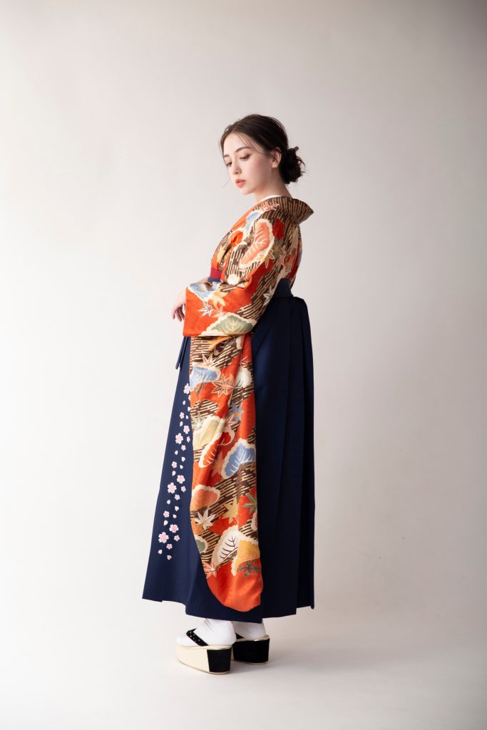 桜柄の刺繍が入ったネイビーの袴です。帯は相性抜群の赤い帯です。