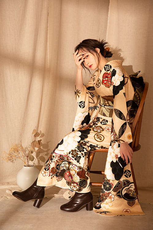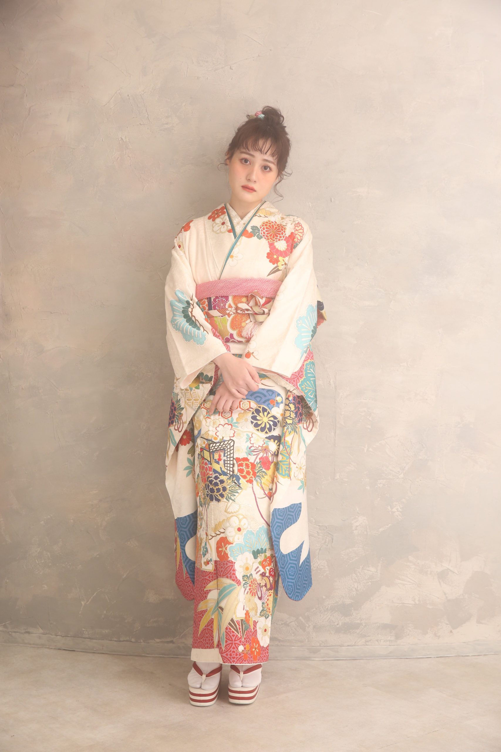 クリーム色にはっきりとしたピンクのお花が引き立つデザインのお振袖。