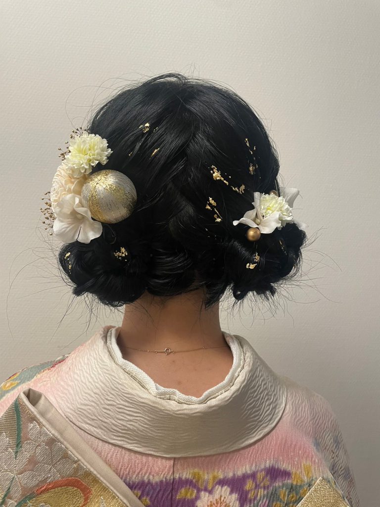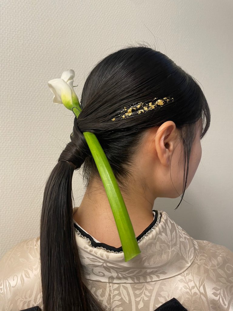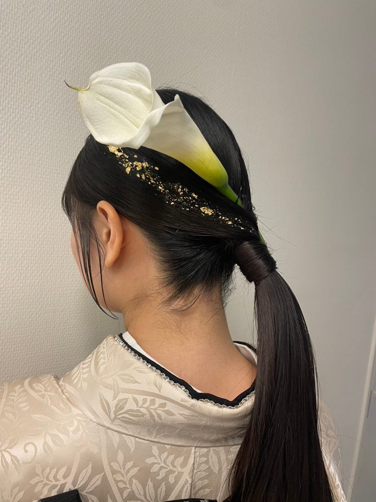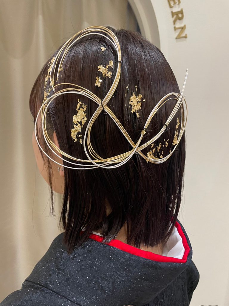 ぱっつんボブスタイルはそのまま活かし、水引と金箔で華やかにアレンジ。