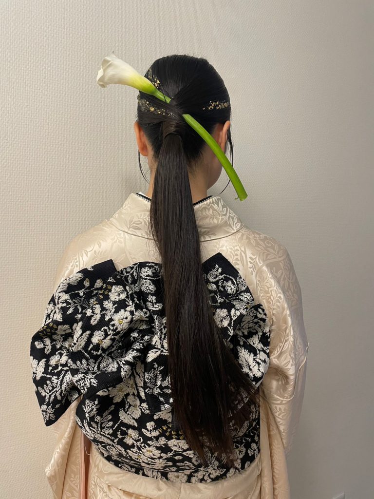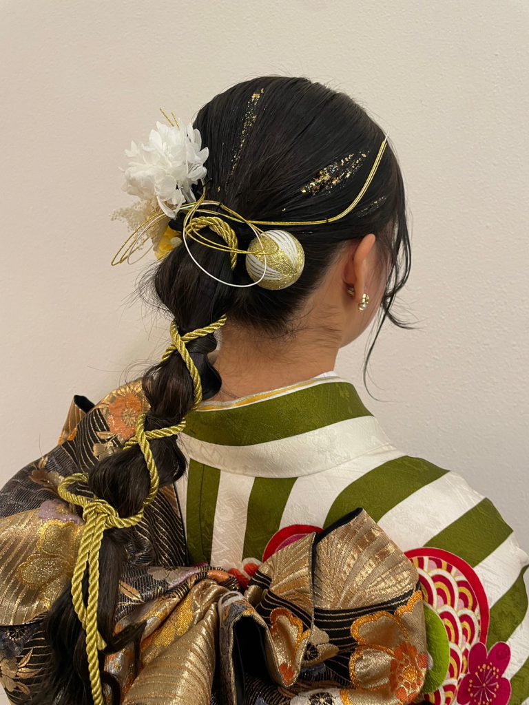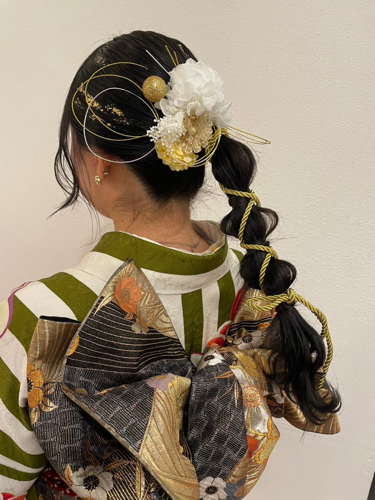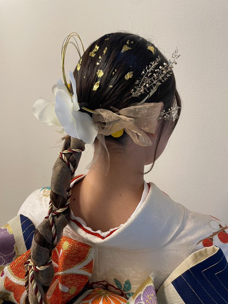 ぱっつんボブスタイルはそのまま活かし、水引と金箔で華やかにアレンジ。