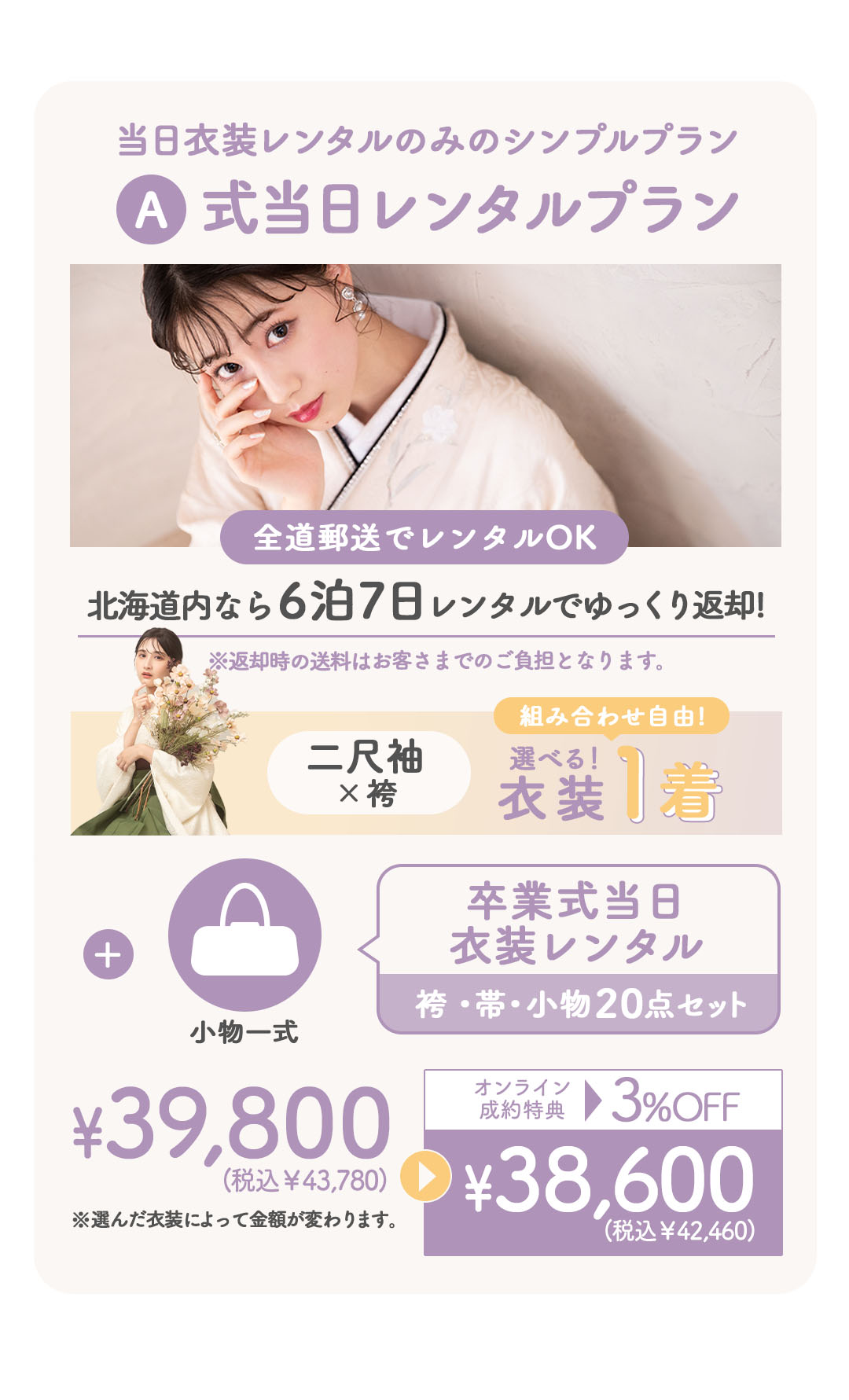 ・選んだ袴によって金額が変動しないクラスフリープランです。