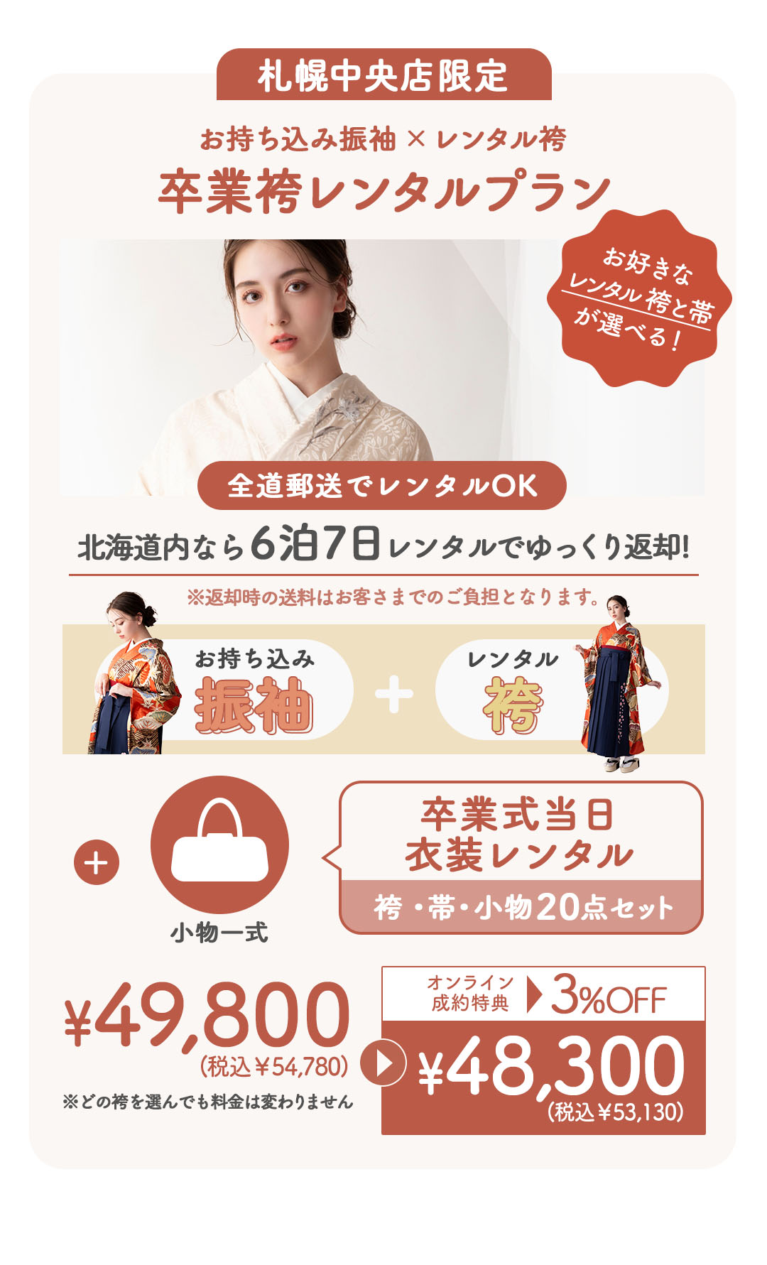 通常、卒業式当日の袴レンタル&お支度と撮影を希望される場合、2つのプランをおとりいただく形となっております。