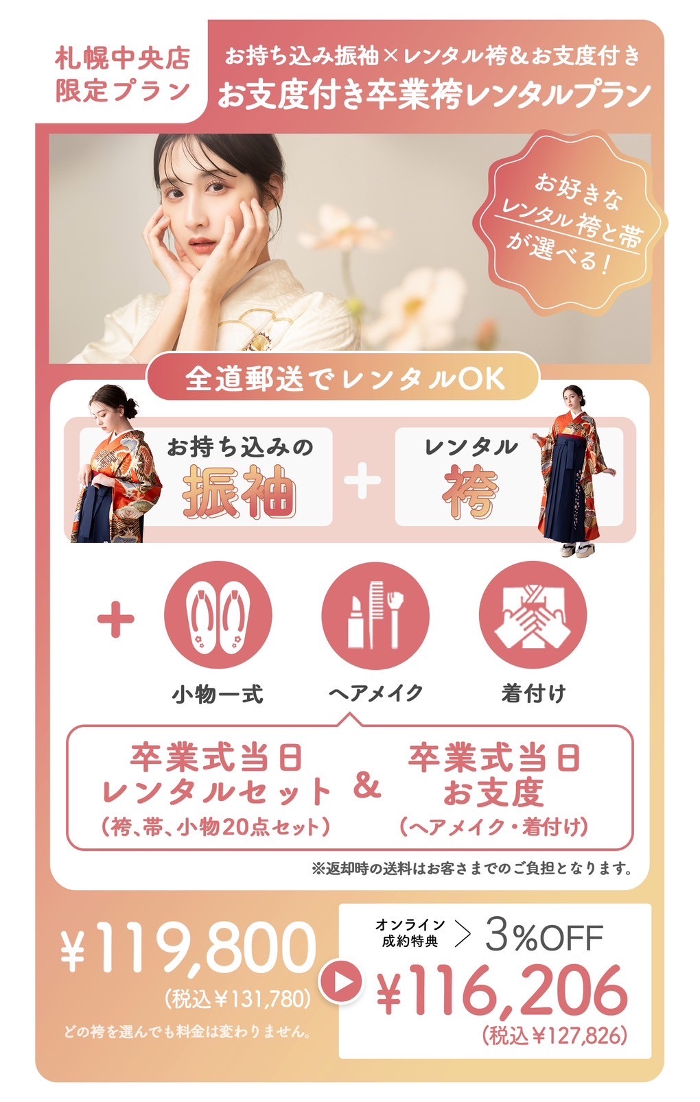 北海道札幌市中央区の振袖&卒業袴レンタル・前撮りフォトスタジオの写真工房ぱれっと札幌中央店です! 2024年、2025年に卒業を控えているお嬢様必見! 67,760円もお得に撮影&式当日お支度が叶うプランが2/17(土)、2/18(日)2日間限定で登場! 是非、この2日間がチャンスですのでお見逃しなく♡