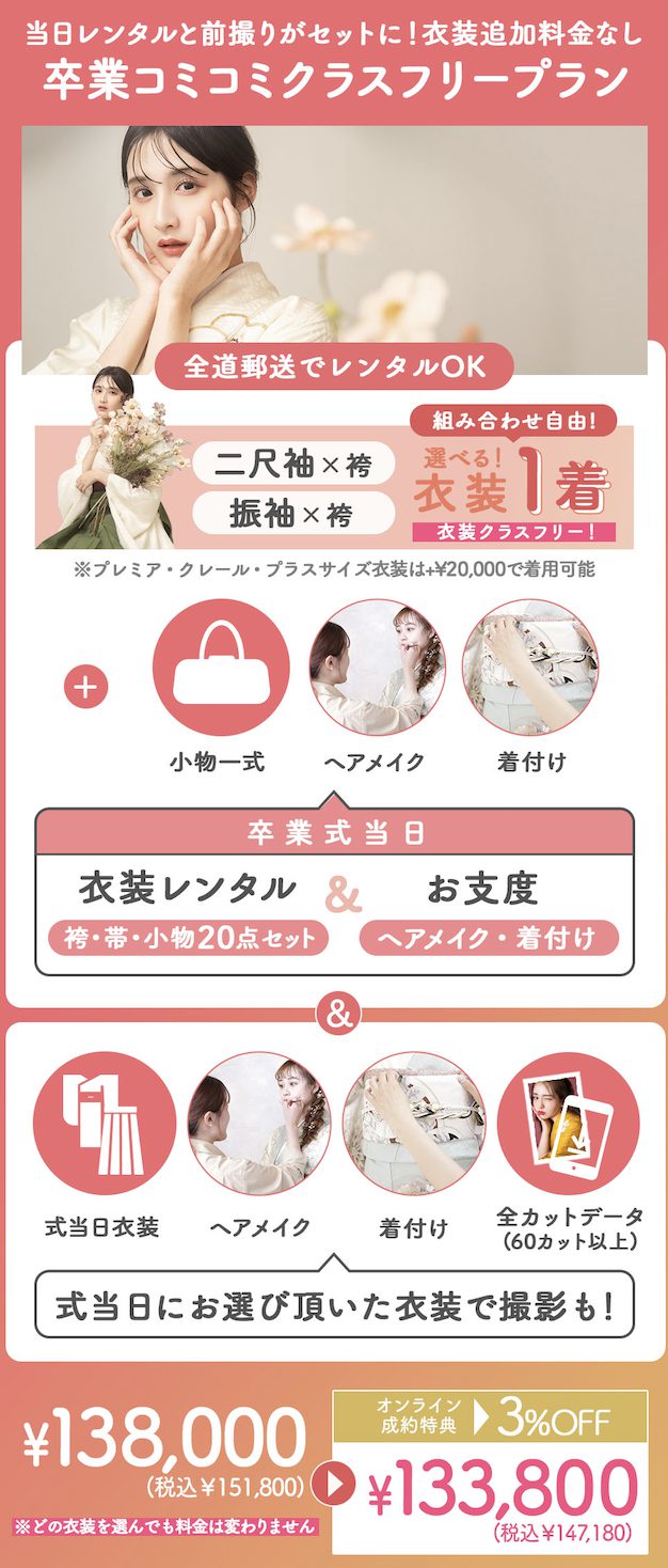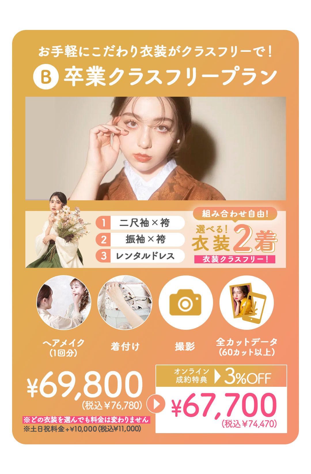 今回登場する2日間限定卒業コミコミクラスフリープラン(¥151,800)と比較すると、¥67,760もお得に撮影も当日のお支度も叶えることが出来ちゃうんです!